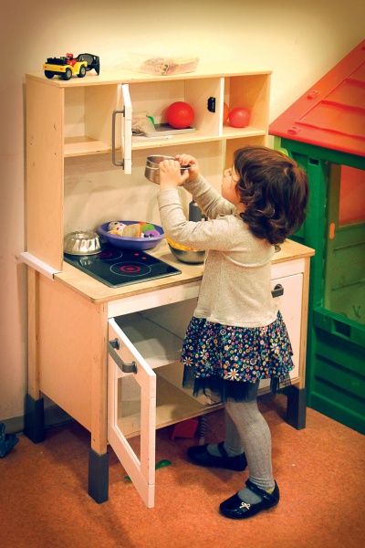 - Дочки-матери. Для этой игры желательно организовать уютный уголок с кукольными кроватками, коляской, люлькой. Не лишней здесь будет и «кухонная» зона (к игре в дочки-матери часто присоединяется игра в поваров), а также зона ванной с местом для купания кукол, стирки и сушки белья. Для этого не нужно оборудовать целую комнату: достаточно сделать из картонных коробок плиту и стиральную машину, а также натянуть веревку с маленькими прищепками. У кукол должно быть постоянное место обитания, чтобы их было приятно взять в начале игры, а при её окончании положить или посадить на место. Отрицательный пример: вид кукол, лежащих в коробке «как попало», отчасти или полностью отбивает у ребёнка желание играть с ними.