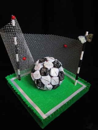 Для изготовления футбольного мяча понадобятся конфеты конусообразной формы, типа трюфель. Предпочтительно, что бы цвет фантика у этих конфет был белого и черного (темно-коричневого) цвета. Если вы не смогли найти конфеты с фантиками таких цветов, то можно сделать дополнительную обертку из полисилка (мягкий фольгированный материал) подходящих расцветок. С помощью клеевого пистолета все конфеты приклеиваются на зубочистку. При этом кончик фантика можно немного подрезать, что бы он не был длинным, а затем при помощи нитки или скотча фиксируем кончик на зубочистке. Подготовленные таким образом конфеты, необходимо разместить на шаре из пенопласта или фитофлоры (используется для цветочных букетов). Вставляя конфеты в шар, учитывайте расположение рисунка на футбольном шаре, то есть вокруг черной конфетки поставьте пять белых конфеток. Таким образом, нужно заполнить всю поверхность шара. Футбольный мяч готов. Теперь, разместите его на подставке, обклеенный зеленой бумагой и сделайте ворота из сетки, используемой для упаковки цветов. Ваш неповторимый шедевр готов!
